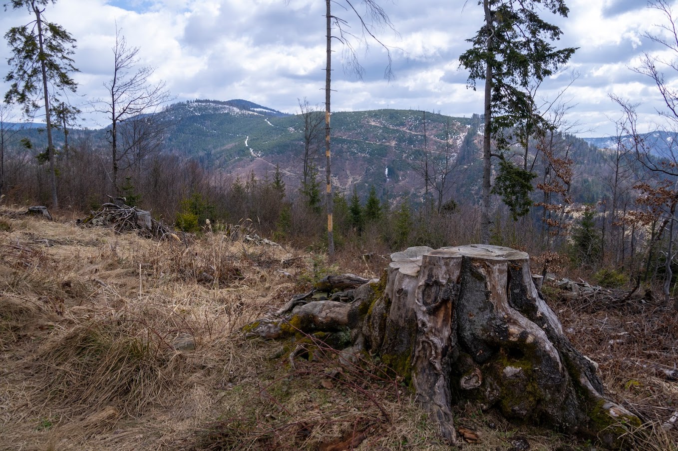 Tu też spotykam pierwszy śnieg. Po chwili las jednak rzednie odsłaniając kikuty uschniętych drzew, leżące gałęzie...widok ponury, ale dzięki niemu możemy zobaczyć widoki wokół. Wcale nie lepsze. Grzbiet Redykalnego Wierchu, opadający ku Ujsołom, jest cały goły, dopiero nad Zapolanką widać jakieś resztki lasu.