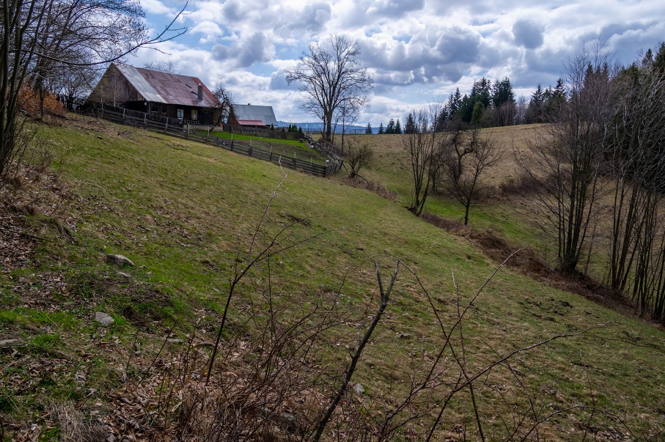 oraz widoczną polanę (na zdjęciu wyżej z prawej), na której robiłem przerwę, oraz podziwiałem drewnianą chatę. Szlak znów zakręca by wyprowadzić nas na wprost kolejnego przysiółka, w którym wita nas kolejne stare domostwo, z fajnym płotem:
