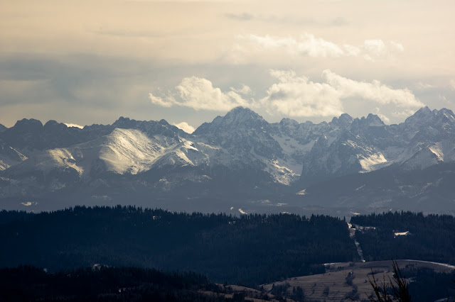 No dobra, czas na nas, ruszamy. Powoli idziemy, bo droga pokryta jest jeszcze kawałkami zlodowaciałego śniegu, a raczków nam się tu nie chce zakładać. Wtem między gałęziami dostrzegamy wieżę przekaźnikową, oraz bielące się w oddali Tatry:
