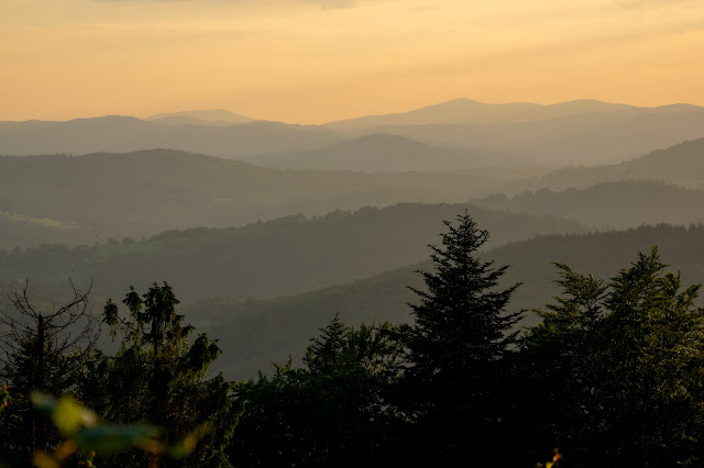 Księżyc nad drzewami...widok na okolicę, na leżące niżej przysiółki, ścieżka wiodąca do góry...pięknie, ale właśnie tu pierwszy raz w głowie przychodzi myśl albo o skończeniu wędrówki. Dzień był bardzo gorący, więc cieszę się, że wyjście zacząłem pod koniec dnia, po 18,30, ale i tak odczuwam trudy tygodnia i po prostu mam dość.