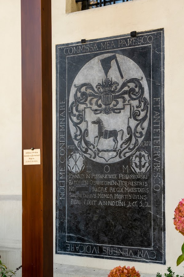 Jednak najciekawsze jest na jednym z filarów bramy wejściowej. To wmurowana w 1854 roku płyta nagrobna śląskiego szlachcica Jakuba Saszowskiego z Gierałtowic (vel Gierałtowski z Gierałtowic), oświęcimskiego sędziego, z Domu Saszowskich, pochodząca z 1546 roku!